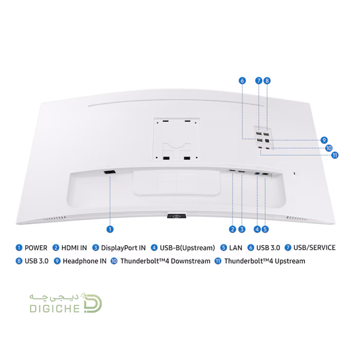 - اتصالات جامع و کاربردی: یکی از نقاط قوت این مانیتور، تنوع بالای پورتهای اتصال آن است. وجود ۳ پورت USB 3.0 امکان اتصال سریع و همزمان چندین دستگاه را فراهم میآورد. همچنین، ۲ پورت USB Type-C، یک پورت HDMI و یک پورت DP (DisplayPort) انعطافپذیری فوقالعادهای را برای اتصال به لپتاپها، کامپیوترها و سایر دستگاهها ایجاد میکند. این پورتها به کاربران اجازه میدهند تا به راحتی تنظیمات چندمانیتوره را پیادهسازی کنند.